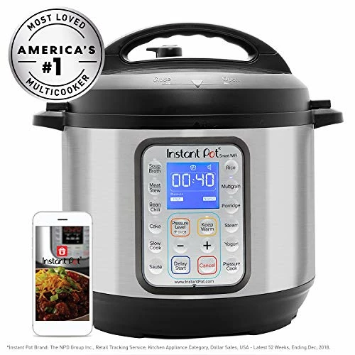 - Cooks fast and saves time: The Instant Pot Smart Wifi combines 8 kitchen appliances in one: Pressure cooker, slow cooker, rice cooker, yogurt maker, cake maker, Saute pan, steamer, and warmer