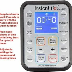 The Instant Pot Smart Wi-Fi has arrived on the kitchen scene. The first multi-use programmable pressure cooker that can now be controlled and monitored with your mobile devices. Designed with a large display screen, stainless steel cooking pot, 6 quart, 1000 watts. Not only will you experience meats cook faster, inexpensive cuts of meat become more tender with a melt-in your mouth texture that few other cooking methods can replicate especially in less than an hour. You can now cook beans and lentils with no pre-soaking making last minute meal planning much easier. Even tough beans like chickpeas, and kidney beans can be prepared in approximately 30 minutes. How about chili or Irish stew prepared within an hour, risotto in 30 minutes, and best of all, with no stirring or watching over the dish as it cooks. Simply, monitor the progress of your meal from eith your mobile device. Mobile devices, for Android 5.0 or later and for iOS 9.0 or later. Cooker requires 2.4GHz Frequency band to operate with app.