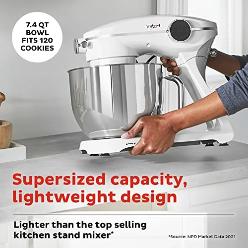 - ALL-IN-1: With 600W of power, this Instant mixer is a powerhouse. It comes with (1) 7.4-qt stainless steel mixing bowl that can make up to 120 cookies in a single batch, (1) mixing paddle, (1) dough hook, (1) whisk, and a removable pouring shield.