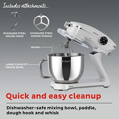 - EASY-TO-CLEAN: Dishwasher safe stainless steel mixing bowl, paddle, dough hook and whisk help provide an easy cleaning experience after you’re done with your Instant stand mixer.