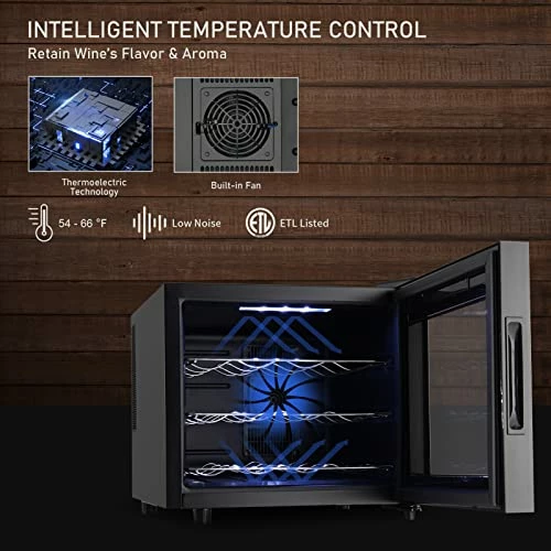 - ?KEEP WINE COOL: The wine cooler possesses superb technology, adjustable temperature control from 54-64 Β°F. Besides, the wine fridge equips with a built-in fan that maintains a consistent temperature throughout, not affected by outside heat sources.