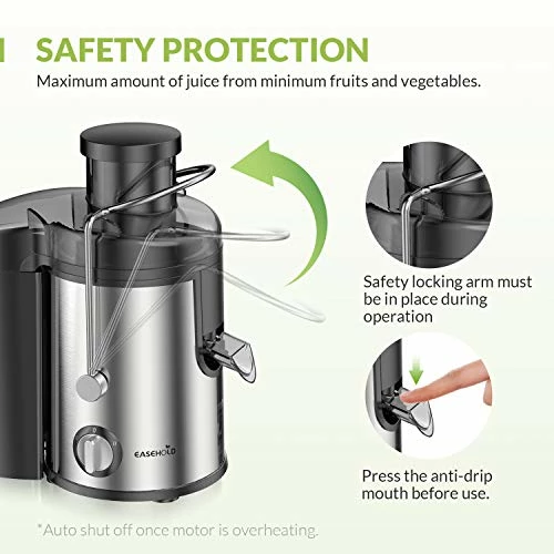 - Safe for Use: Safety is always our priority. This juicer extractor will not operate without juicer cover in place and safely locking arm in place in the vertical position. The overload protection system will shut off the juicer once overheating.