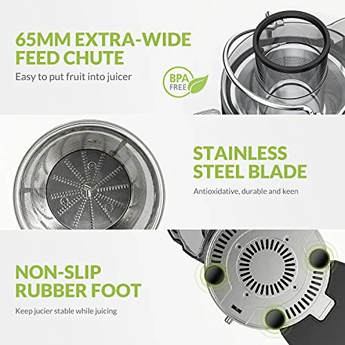 - Higher Juice Yield: BPA free food grade stainless steel blade surrounded by filter to extract more juice, vitamins and minerals than other juicers with our special 2.56 inches inlet. Powerful stainless-steel blade for faster results with 2 speeds options.