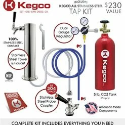 - INCLUDES COMPLETE KEG TAPPING KIT: This high-quality keg beer cooler comes complete with everything you’ll need to dispense fresh draft beer straight from the keg – you just add the keg! The single faucet keg beer dispense system includes a brand new 5 lb. aluminum CO2 tank, a single gauge CO2 regulator, a D system lever handle keg coupler that can tap all domestic kegs, and a 3″ diameter chrome plated metal draft tower. The CO2 tank ships empty and will need to be filled locally.