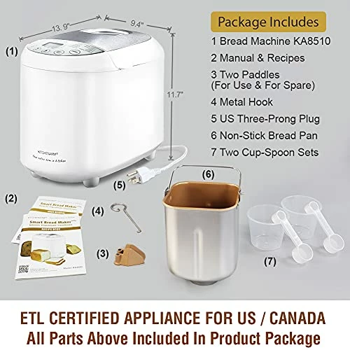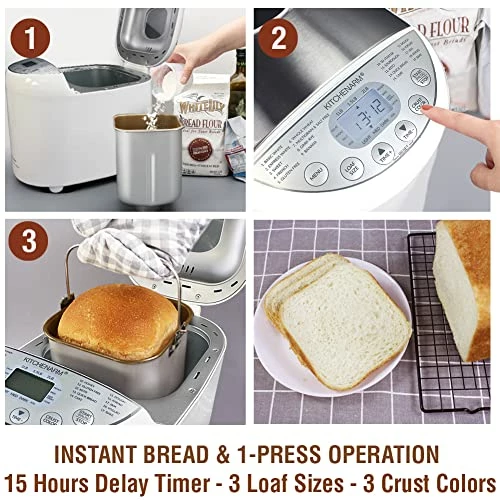 - INSTANT BREAD & 1-PRESS OPERATION – Support most brands of pre-packaged bread mixes for instant bread: no more ingredient hunting or measuring. – All your settings are saved: Menu Selection / Loaf Size / Crust Color. – It becomes 1-PRESS operation if you use the same recipe the next time: just add ingredients and press the START button ONCE. – 3 Loaf Sizes, 3 Crust Colors, 15-Hour Delay Timer, ADD-NUTS Alarm, etc. – You can even increase the dough RISE time ON THE GO for more control.