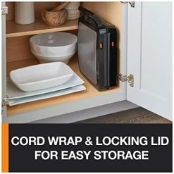 - Sleek stainless steel design: Stainless steel housing offers modern style; cord wrap and handle lock for convenient, compact storage