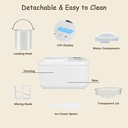 - Easy to Operate- A simple button control panel with LCD Display and Timer is user-friendly. Just add ingredients to the bowl, lid-lock, press ON and choose the mode, the frozen yogurt machine will show the time and does the rest! A beep sounds to indicate completed.