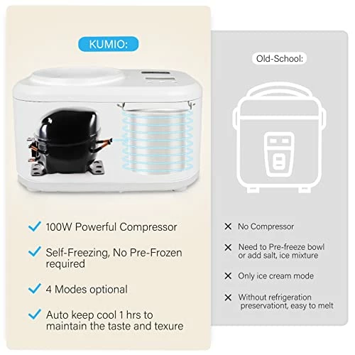- 4 Modes & Keep Cool Function- KUMIO Ice cream maker features 4 Modes: ice cream, yogurt, single mix, single refrigeration. To maintain a chilled state and freshness, the sorbet maker will auto-keep cool 1hrs without other operation.