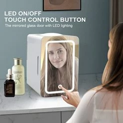 - Portable Mini Fridge – Take this travel fridge anywhere, the appearance is designed with a mirror and LED lights, only touches the button to turn on the lighting lamp, enjoy the mirror and light at the same time, which is convenient for makeup.