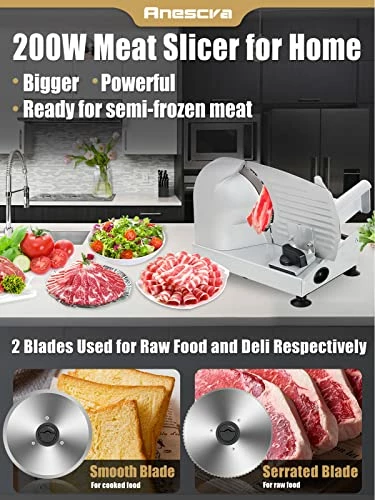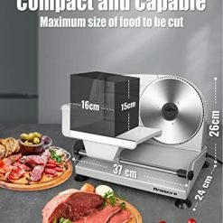- โ 200W Powerful Meat Slicer: The update electric food slicer is driven by 200 watts of fast, high yield slicing power. This is a highly versatile model, with enough power and speed to slice pretty much anything. Not just meats, but cheeses, bread, and vegetables, giving you an all purpose slicing machine when you need to quickly crank out meals.