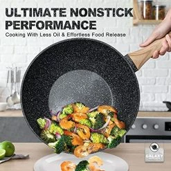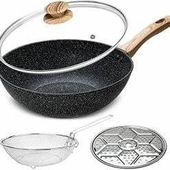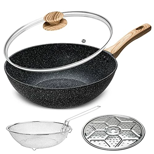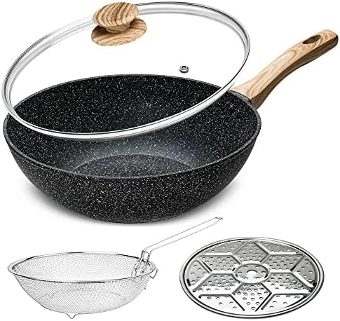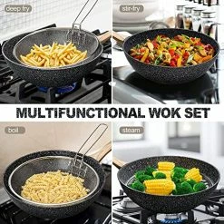 - VERSATILE WOK PAN – This nonstick wok set includes 12 Inch / 5 Quart Stone Nonstick Wok with Lid, Deep Frying Basket, & Roasting Steaming Rack. The nonstick wok with lid can be used as deep fry pan, sautΓ© pan, deep skillet, frying wok, stir fry wok, stir fry pan, baking dish. Which is everything you need to prepare delicious stir-fry, steaming, roasting, boiling, baking meals and more.