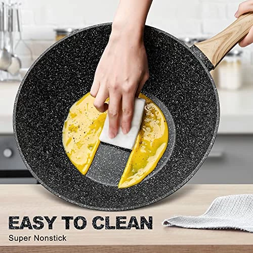- TRIPLE-LAYER NONSTICK COATIN SCRATCH RESISTANT – The nonstick wok superior Stone Coating & Titanium interior which is ultra nonstick and scratch resistant that enhances both durability and cooking performance. Food slides right off on the truly nonstick surface for optimum cooking. Cleans up easily, dishwasher safe (hand wash is recommended).