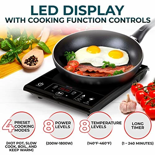 - Digital Touch Control Panel And LED Display: This great induction cooktop has built-in count-down digital timer with 1 minute increments up to 240 minutes and 8 – temperature range from 140 Β°F to 460 Β°F; 8 power levels from 200 to 1800 Watts. Try it out and thank us later. Choose between 4 preset programs: hot pot, slow cook, boil and keep warm with ease.
