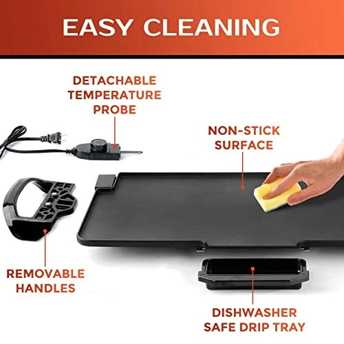 - A Breeze To Clean – The smooth non-stick cooking plate makes cleaning effortless, and in most cases a simple wipe over with a sponge and dish soap is all it needs! The handles and temperature probe are removable, while the drip tray can be popped in the dishwasher to effectively remove grease.