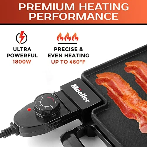 This product does not have a removable plate, regardless of what it states. It simply has removable handles and drip tray, but the plate is permanently attached to the heating element and electrics and cannot be submersed in water. This does not affect the review as I figured it out before I ordered.First, the handles are a bit loose, but it does not affect cooking. Second, the heating element is exposed underneath the griddle so you must use on a heat resistant surface. I just use my stove. This could be a burn hazard if you have curious, small children.My product came with two scratches from the manufacturer, but we decided to keep it anyway. Seems too small an issue for a return/exchange.We ordered this because of the higher wattage (1800) and the extra, extra-large size (12×24). The higher wattage allows for the griddle to sear meat and the larger size keeps foods from crowding, important for sautéing a large quantity of mushrooms with a steak. Eggs cook very nicely but there is a learning curve to lifting them off the griddle with the non-stick coating and lack of any sizable lip on the sides.What would have taken two or three pans before became a pretty easy task with this. Everything came out perfect and tasted great.One small issue was test cooking a fully thawed hamburger (Great Value, 75% lean, 25% fat). The grease did not drain and basically steam cooked the burger with little searing or browning. You might keep a roll of paper towels handy or keep moving the burger and spatula off the grease…. or use a leaner burger?