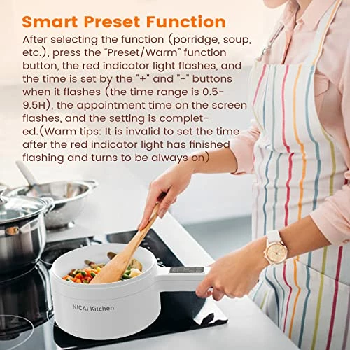 - ?γIntelligent Control Panelγ Electric hot pots equipped with an intelligent control panel with a time display. You can press the button to adjust the power, and cooking time and choose the various functions Making different dishes,the heat preservation function, the reservation time is 0.5H~9.5H, and the heat preservation is up to 8H. If you’re dating at night, you can wake up to a delicious breakfast in the morning.
