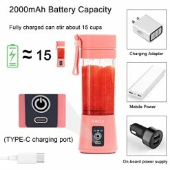 - Rechargeable: Electric juicer cup has a built-in 2000mAh rechargeable battery, recharged through power banks, laptops, computers or other USB devices. Charge 3-5 hours and use 15-20 times.