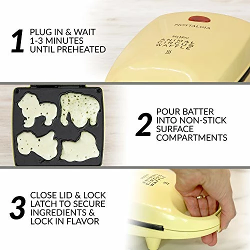 - FOUR ANIMAL SHAPES: Make breakfast fun again by making Cat, Dog, Elephant and Lion shaped waffles Each batch makes four delicious, golden brown waffles at a time in just minutes