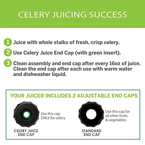 - Includes 2 Adjustable End Caps: This juice extractor comes with a special adjustable end cap made specifically for juicing celery (it is NOT meant to juice any other fruit or vegetable); A second adjustable end cap is including for juicing all other fruits and vegetables