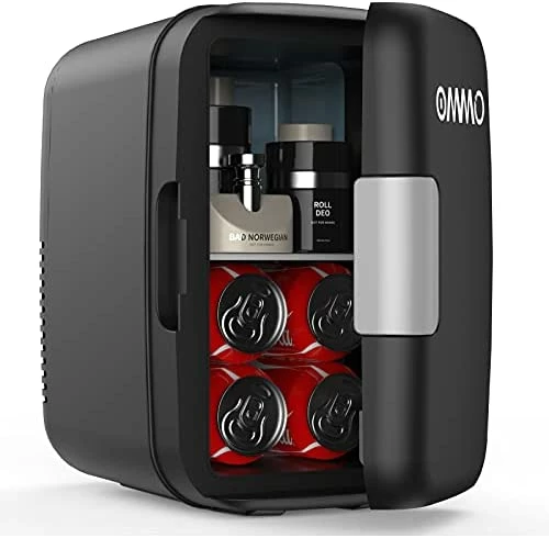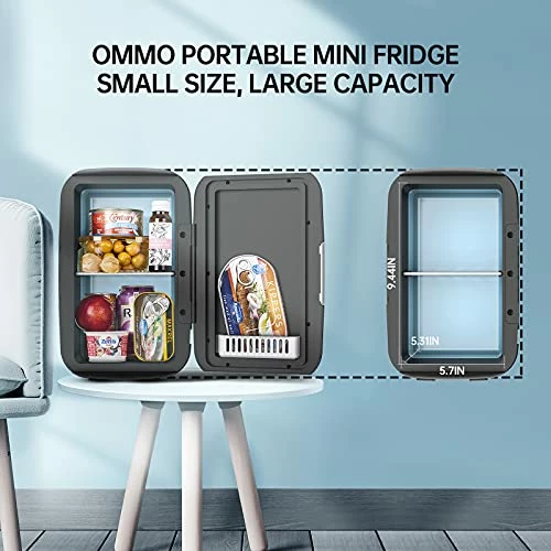 - ??6 Liters Multifunctional Mini Fridge: OMMO mini fridge with 5.3 * 5.1 * 9.3 inches(6 liters) capacity, which is easily stored 8 cans 330ml/ 6 cans 355ml drinks. The small size and stylish design make the compact fridge perfect for any occasion, such as travel, offices, dorms, road trips, boating, camping, commuting, and so on. space saving mini refrigerator can fully meet your daily needs