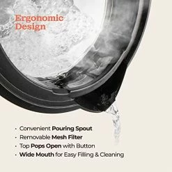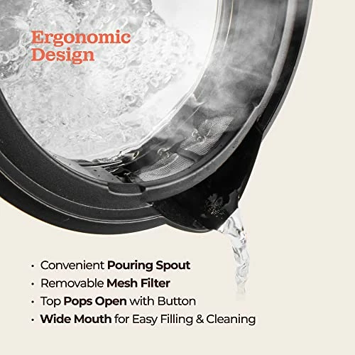- Ergonomic Design-This electric tea kettle has a built-in mesh filter that lets you put tea bags or fruit in the water, ensuring just water passes through. The top pops open with the touch of a button, and the wide mouth makes for effortless refilling and cleaning.