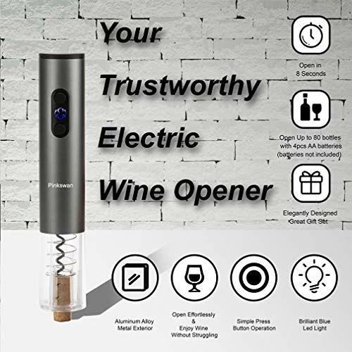 - ใOpen Wine Bottle EffortlesslyใStruggling with stuck corks, weak bottle corkscrews, and messy kitchen countertops? Our automatic wine opener is your best choice. It can open up to 80 wine bottles with 4 AA batteries, and remove the cork in 6 seconds without break the cork by pressing the โDownโ and โUpโ button. Powerful and fast, Perfect for red, white, rose wine, beer, champagne, and others.