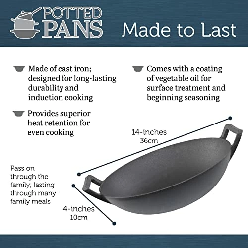 - [Cook Professionally]: Prepare a professional-level, authentic, stirfry with Potted Pans 14 x 4-inch Wok Cast Iron Pan; Wok pan iron pot is the perfect kitchen accessory to prepare restaurant-quality meals