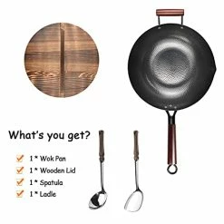 - Long-handled wooden spatula included; dishwasher-safe wok & lid