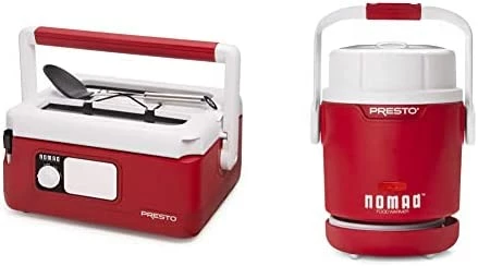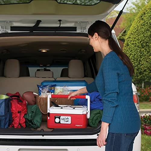 - Wide-profile “picnic cooler-style” design with cool-touch housing and swing-up handle makes carrying easy and prevents tip-overs when traveling