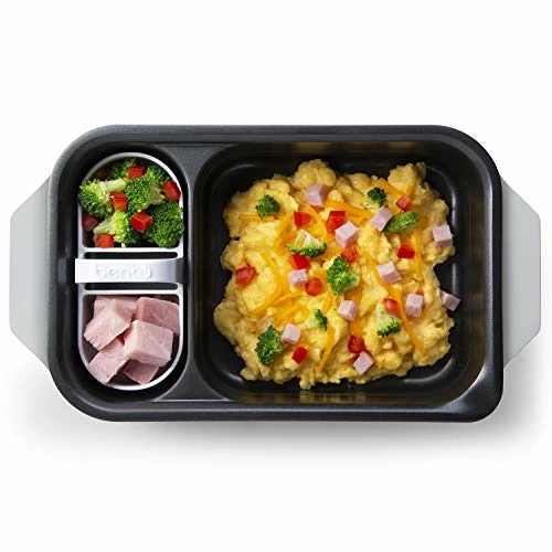 - Cooks a block of ramen noodles on one side and eggs or veggies on the other.