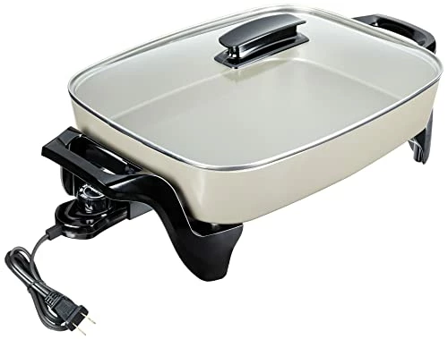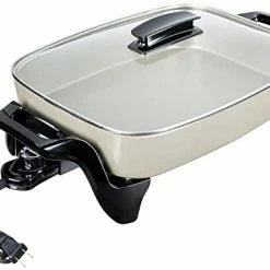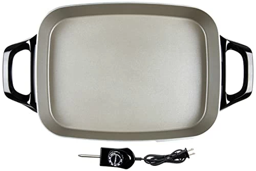 First thing out of the box, I noticed BIG!! Large enough for a big family. I bought this skillet to cook pancakes, and maybe hamburgers. I’ve found it is so versatile, I use it for a lot of other things as well. In the reviews I read, others complained that it has hot spots, and cycles too often, but the instructions say to heat it enough ahead of time to allow it to cycle 4-5 times to heat up to the right temperature and heat evenly. I do that, and have had no problems with uneven heating. It is made of a relatively thin aluminum alloy, which allows it to heat very quickly, but like I said, it needs a few cycles to evenly heat. One of the best things about this skillet is that its ceramic coating makes it super easy to clean. Many of the reviews I read said that they just wipe it out with a paper towel. I wasn’t sure how that would work, and how sanitary it would be, but I tried it and it works very well. As far as being unsanitary, who scrubs their barbeque with soap and water every time they use it? This thing gets plenty hot to kill any bacteria, so I don’t see it as a problem. There’s a temperature guide in the booklet that came with it, and I follow that. Works well. The removable thermostat works consistently well also. I’d definitely buy it again.