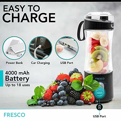 Great for when you add ice or frozen berries to a shake on the go. Can also charge in the car.Use it to blend and drink one shake, then wash and charge. Keep plugged in when not in use.