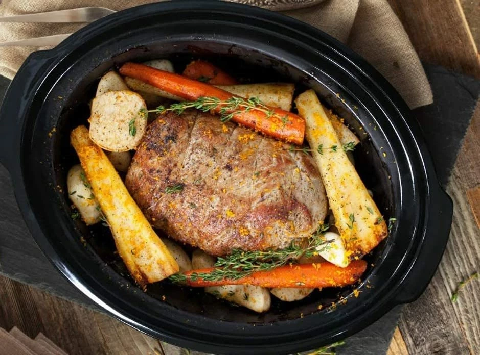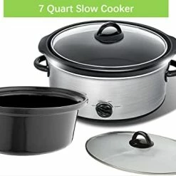 - Perfect for family: 7-Quart capacity serves 8 + people meals. The slow cooker has a big oval stoneware pot that can fit a variety of foods, from lasagna to kinds of meat. It will hold a 6-7 lb. chicken or a 5 lb. roast.