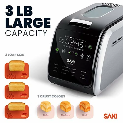 - 3lb Large Capacity: SAKI Bread Maker has 3 bread size settings 2.2 LB, 2.7 LB, and 3.3 LB which makes the largest bread maker among the competitors. Also, SAKI Bread Maker has 3 crust options (LIGHT / MEDIUM / DARK). The display will show the total time according to the selected functions. Designed for professional homemade quality!