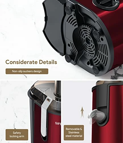 - 【Safety Design and Easy to Clean】Simple to use and all removable parts are dishwasher safe. Juicer Extractor with locking system arm, it will not work without cover locked into place. Overload protection system with positive temperature coefficient thermal resistance inside (while other juicers don’t have ) will switch off machine once overheating occurs, it will automatically shut down for 2 minutes to protect the motor and ensure motor longevity. Detachable parts makes it easy to clean!