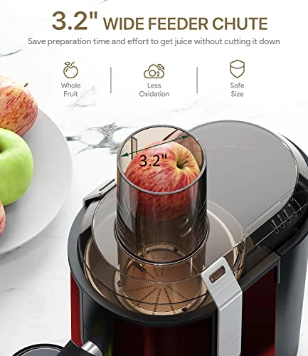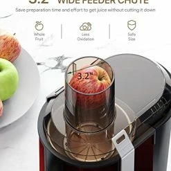 - 【Wide Feed Chute Fits Whole Foods】 The juice extractor is designed with 3.2″ large mouth, allows you to juice even a whole apple, fit your fruits and vegetables inside it without spending much time to cut into smaller pieces, make more fresh and delicious juice quickly, completely free your hands.