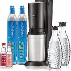 - Includes: seltzer water maker, (2) 60L Co2 cylinders, (2) glass carafes, and (2) 40 ml bubly drops flavors