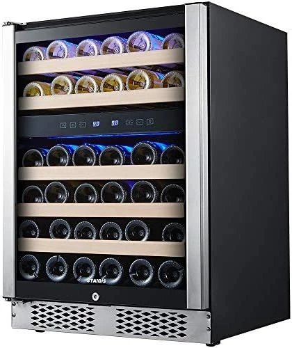 Replacing a wine cooler that failed after 8 years – vendor of the brand we owned projected a ship date of a new/replacement cooler of no earlier than 6-9 weeks. This vendor/brand, Staigis, had good reviews on Amazon, good price, and would ship immediately. Product arrived within days, the Amazon delivery guys brought it into my kitchen, it came well-packed yet was easy to unpack. The door swings the way I want (hinges on right) so there was no set up required (they do include left-side hinges). Dimensions were as advertised – it slid easily into the cabinet space occupied by our old cooler. I let it sit 24 hours as recommended then ran it another 24 hours before loading it. Came to the operating temp I set quickly and also returned to operating temp within a short time after loading it. Easy to set the temperatures, runs quietly, and looks good in our kitchen. The uppermost shelf is large enough to accommodate champagne bottles. The lower zone, “red wine” shelves easily accommodate larger-diameter burgundy wine bottles. Overall, I find it accommodates various (and larger) size bottles better than the cooler I replaced. Others have commented about the brightness of the LED temperature display – it is bright (picture a blue night light in your kitchen) and there is no way to dim or shut it off – it’s not a problem to me but you should take note of this if you feel it will annoy you. So, three weeks in, I am pleased with this purchase.