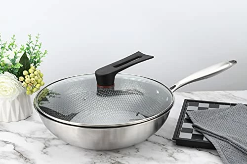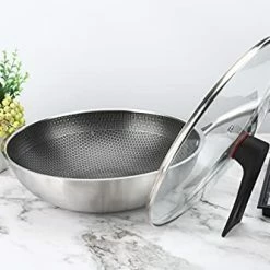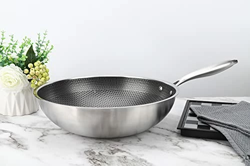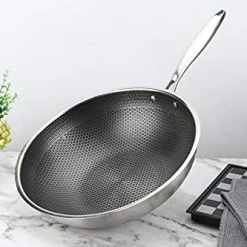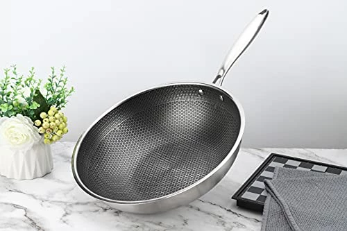 - The stainless steel wok is made of premium SUS304 Food Grade stainless steel material. The interior nonstick layer is made of Honeycomb texture, The diameter of our stainless steel wok is 12inch, it could satisfy the needs of a family of 4-6 people. And you can use any spatula that you like. It would not get hurt.