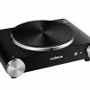 I don’t use this at the table. I hate grease splattering all over my clothes, dining room and breakfast room walls/ furniture/artwork. At high temperatures, oil molecules travels so fast they’re actually injected into your drapery, upholstery, and form films on hard surfaces. You yourself may not notice the odor because you live there, but it’s there. If you grill at table, and don’t shower afterwards, your pillowcase will smell like grease. I use this on my range, which has a built in grill plate. If you don’t have a flat surface for this, you’ll need a wok ring. This pan has feet, and IS NOT STABLE on a burner without a wok ring because some fo the feet will not sit on your burner spokes. We get paper thin beef sliced at the butchers, and the pan works great. It is domed, so doesn’t work for anything that might roll down to the perimeter. Unless you really like the novelty of oil flying everywhere, a regular grill pan is just as good.
