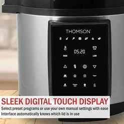 - MULTI-PURPOSE: All you need in one. The Thompson multi-use pressure cooker is also an air fryer, pressure cooker, slow cooker, rice cooker, steamer, yoghurt maker and warmer. There are two separate cooking lids. One is a classic pressure cooker lid that has an adjustable release valve, as well as a button that prevents prematurely opening the lid. The second is an air frying lid, that is packed with 1500 watts of power. This lid uses cyclonic heating techniques to cook your food on all sides at once.