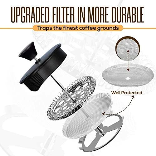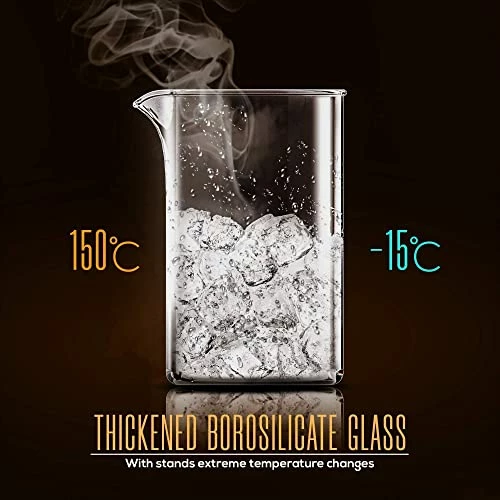 - Durable heat resistant borosilicate glass carafe beaker sits in stylish insulated plastic frame which makes pouring coffee easier and prevent wobbling