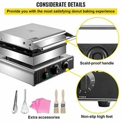 - Double-sided Heating: Equipped with parallel heating pans, this commercial donut machine ensures donuts are heated evenly during baking. Meanwhile, our 2000W high-power donut machine makes the surface temperature of plates rising rapidly, significantly reducing baking time and allowing you to get 9 pieces of 9×3 cm nice-looking and delicious donuts within 5 minutes.