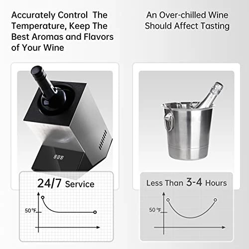 - Easy to Use: Step1: Turn on the wine bottle chiller. Step 2: Set the temperature. Step 3: Place a suitable bottle (less than 3.74โ in diameter) in the wine chiller. Step 4: The device begins to cool down. The LED will flash until the set temperature is reached. After that, it will be continuously illuminated.