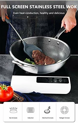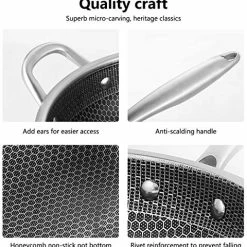 - 1.The 13.4 inch stainless steel wok has a honeycomb shape inside the non-stick pan to achieve a non-stick separation state.